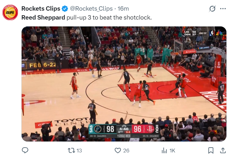 这场比赛火箭后卫里德-谢泼德登上了全美第三热搜,因为他这场比赛沉寂了三节后在末节最关键的时刻挺身而出,他单节12分帮助火箭逆转西部第二的马刺,火箭也拿到了三连胜。