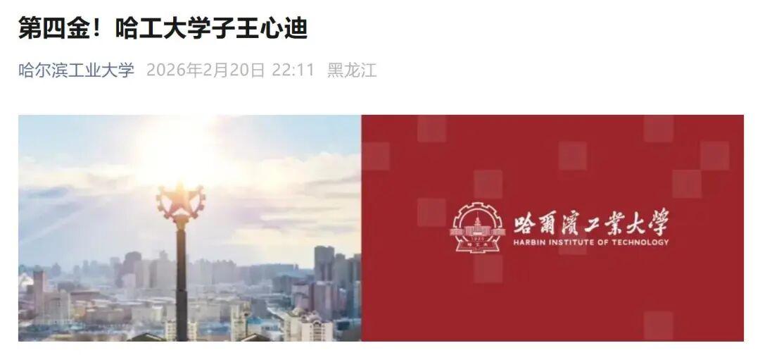 哈工大官微发文祝贺王心迪夺冠。